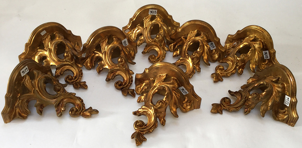 Gruppo di otto mensoline dorate (h cm 20) (difetti)