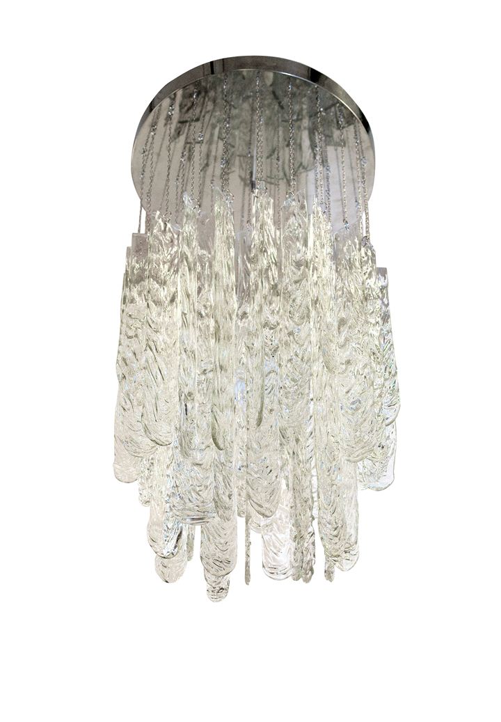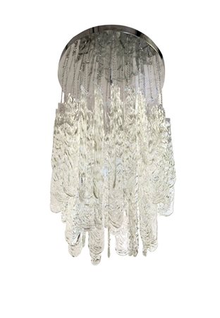 Coppia di lampadari composti da elementi sospesi in vetro di Murano lavorato in lastra.