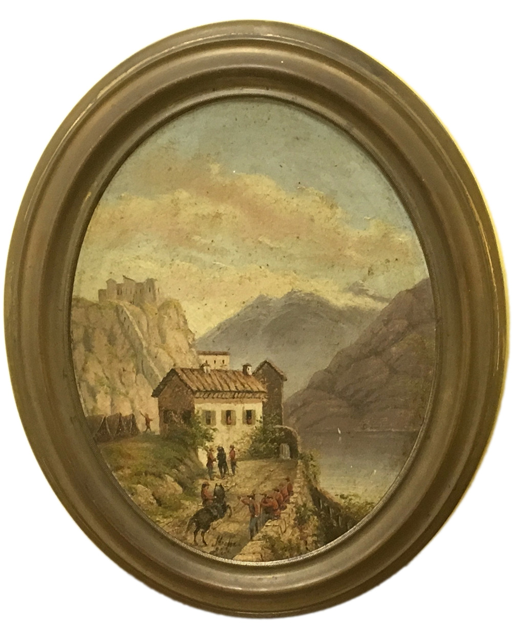 Scuola del secolo XIX "Scorcio di lago con militari" olio su cartone ovale...