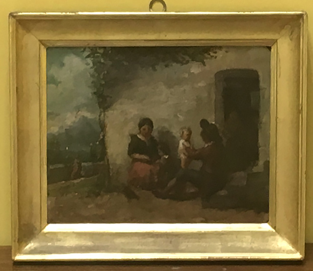 Ignoto fine secolo XIX "La famiglia" olio su tavoletta (cm 20x25) in cornice (difetti)