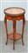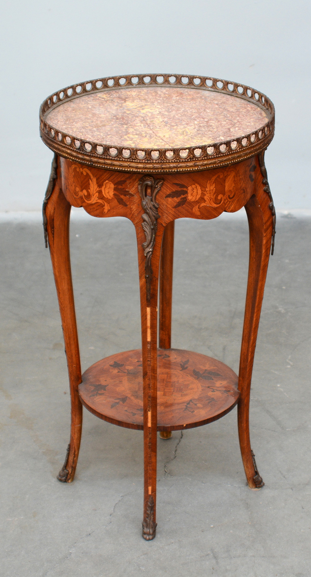 Tavolino d'appoggio lastronato e intarsiato a fiori, gambe mosse riunite da pianetto, piano tondo in marmo decorato da ringhierina in metallo (d cm 32, h cm 60) (difetti e mancanze)
