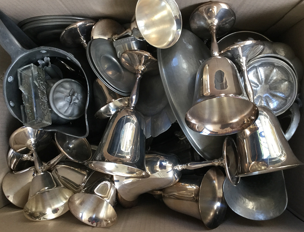 Cartone contenente numerosi oggetti principalmente in peltro (difetti)