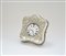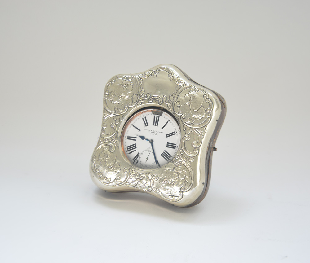 BOODLE & DUNTHORN LIVERPOOL Orologio da cornice in metallo con movimento con carica remontoire a otto giorni, quadrante in samlto bianco con numeri romani. In custodia di pelle e argento (d cm 8 circa) (difetti)