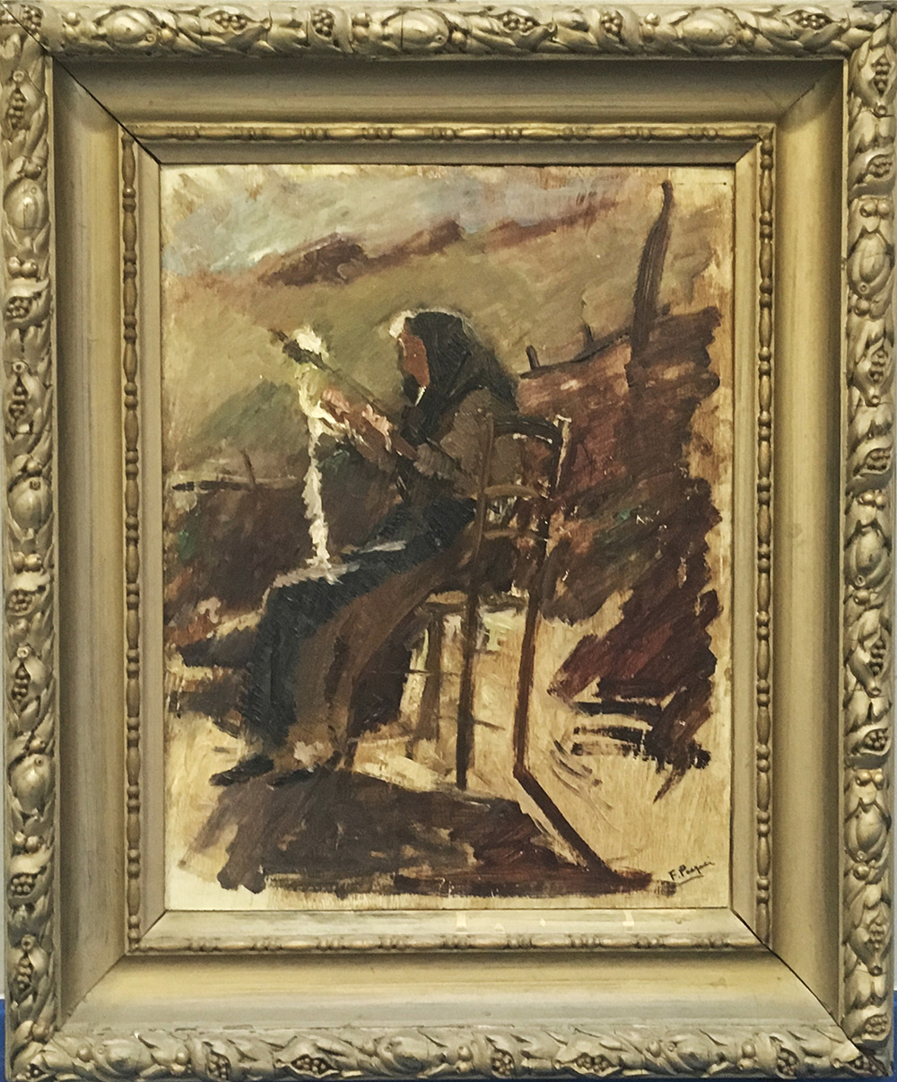 Ferruccio Pasqui "Vecchietta" olio su tavoletta (cm 40x30) firmato in basso a destra. Al retro: cartiglio. in cornice (difetti)
