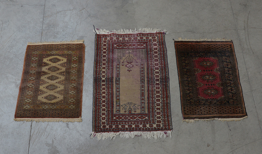 Lotto composto da tre tappeti Pakistan, sec. XX. Uno a preghiera e due con disegno Bohukara (il più grande cm 110x76) (difetti)