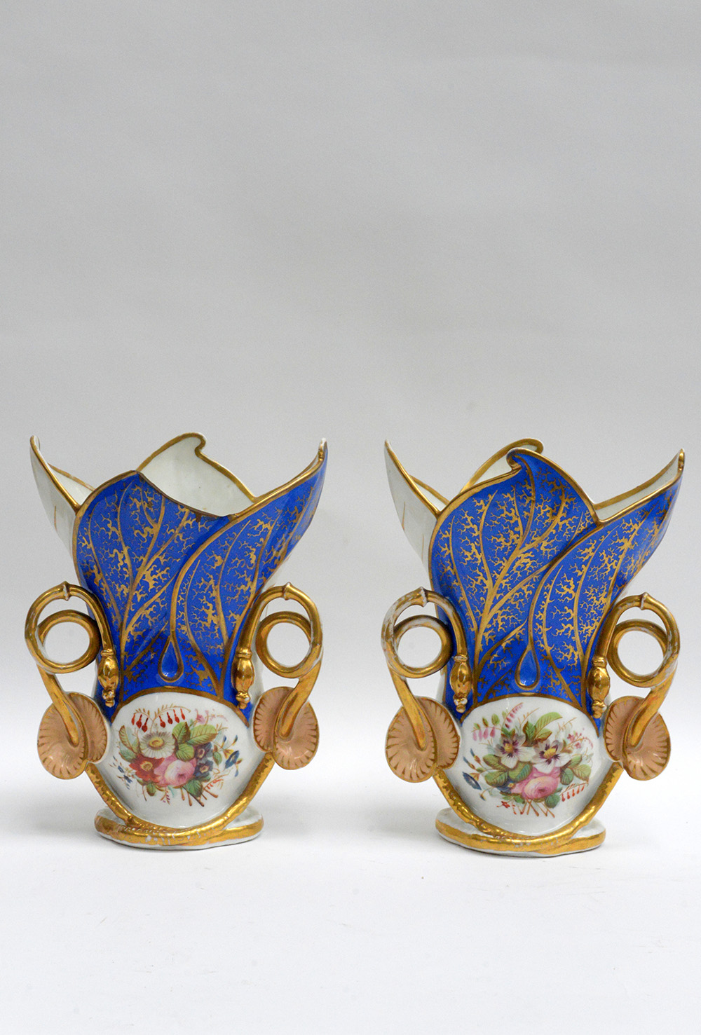 Coppia di vasi in ceramica policroma a decoro naturalistico con bocche a forma di foglie e anse a fiori (h cm 28) (difetti)