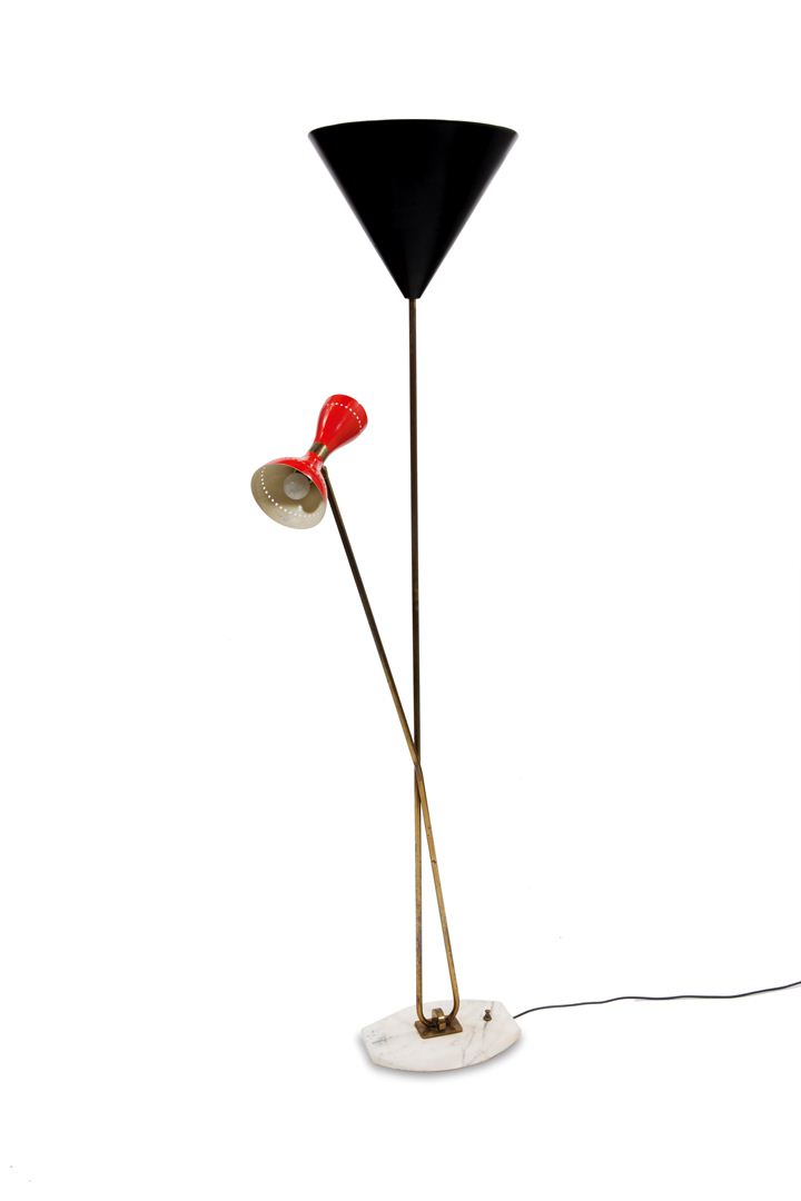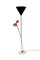 Lampada da terra con diffusore in alluminio laccato nero, faretto orientabile in alluminio laccato rosso.