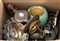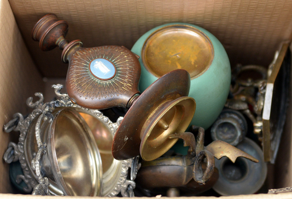 Cartone contenente numerosi candelieri in metallo e bronzo tra cui una piccola anfora in rame smaltato eseguita dall'argentire Mircaoli. Milano, anni '30/'40. (difetti) -EN Cartone contenente numerosi candelieri in metallo e bronzo tra cui una piccola anfora in rame smaltato eseguita dall'argentire Mircaoli. Milano, anni '30/'40. (difetti)