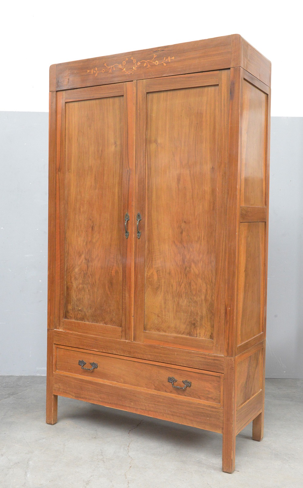 Armadio a due battenti con cassetto alla base decorato da un piccolo intarsio floreale (cm 120x213x48) (difetti)