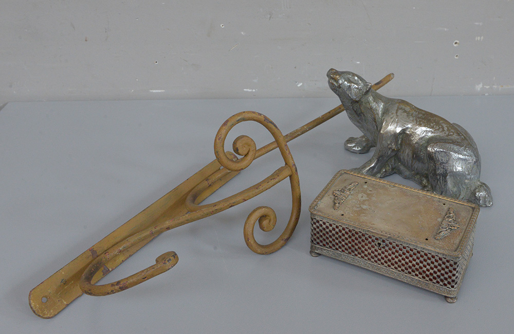 Lotto composto da una sculturina raffigurante orso, una scatola e un porta abiti in materiali diversi (difetti)