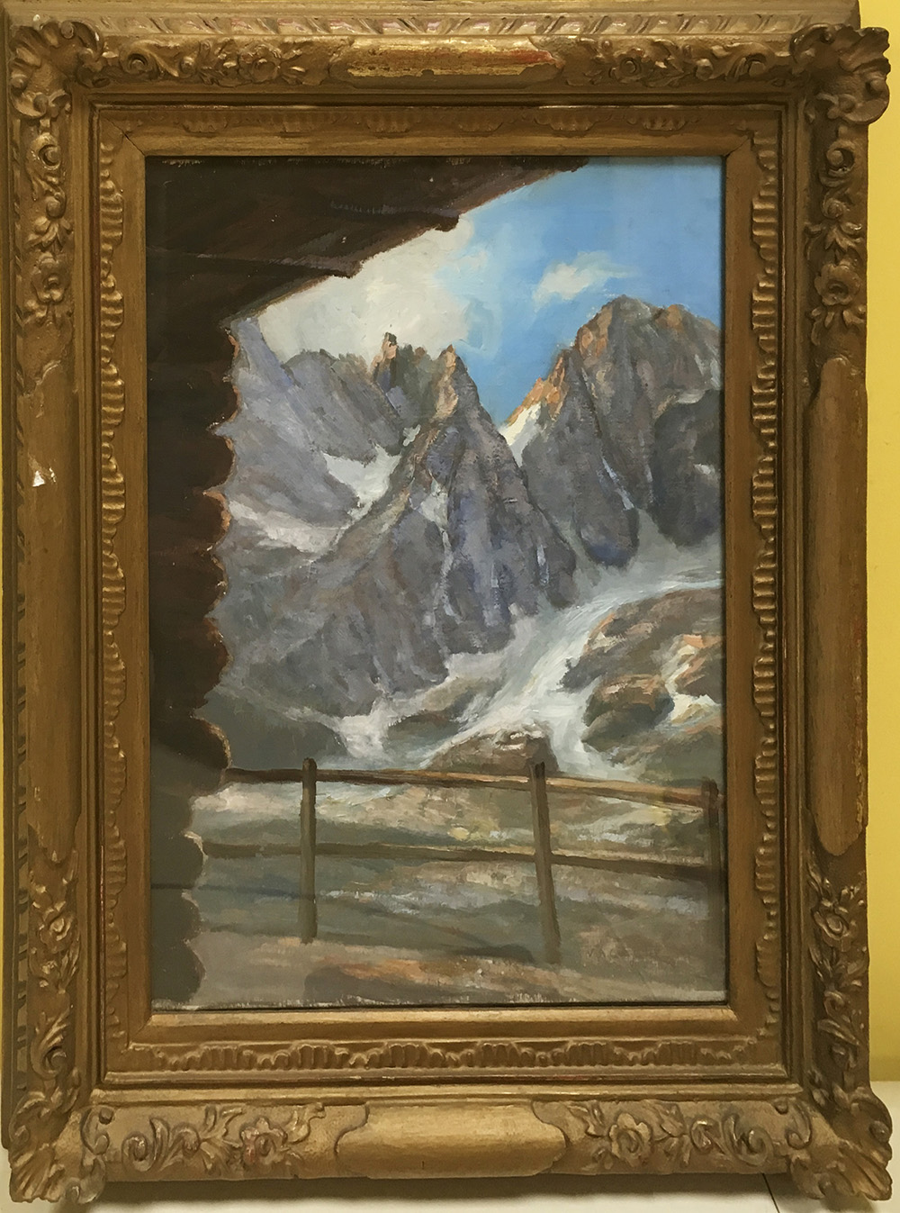 Vittore Antonio Cargnel (Venezia 1872 - Milano 1931) "Le pale di San Martino dal rifugio Previtali" olio su cartone telato (cm 39x30) firmato in basso a destra, titolato e dedicato al retro, in cornice(difetti)