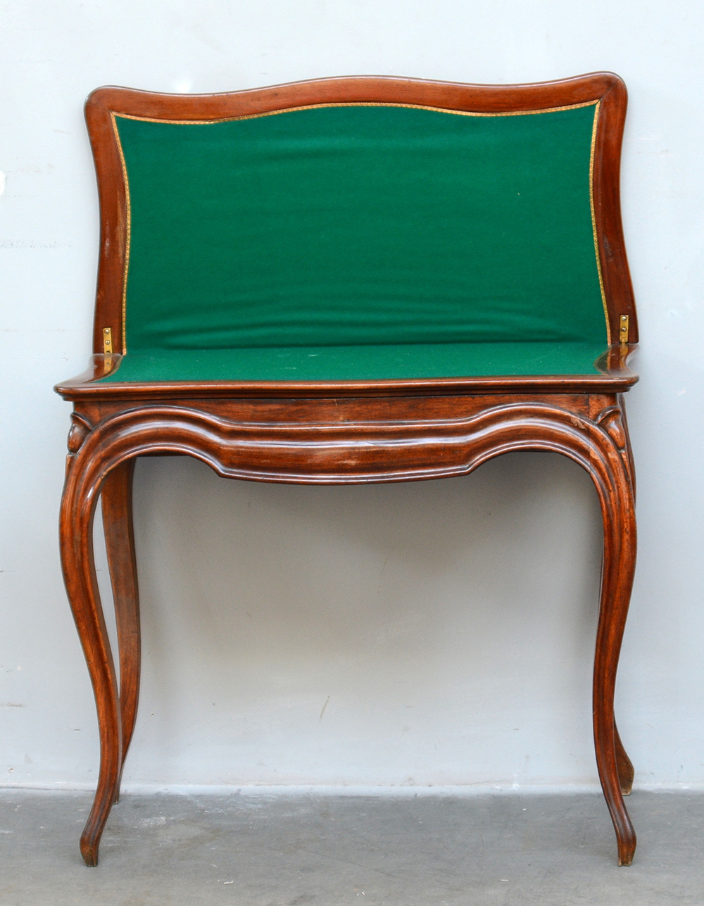 Tavolo da gioco con piano sagomato a libro, lastronato in noce e radica. Fascia e gambe mosse e scanalate (cm 85x75x43) (difetti)