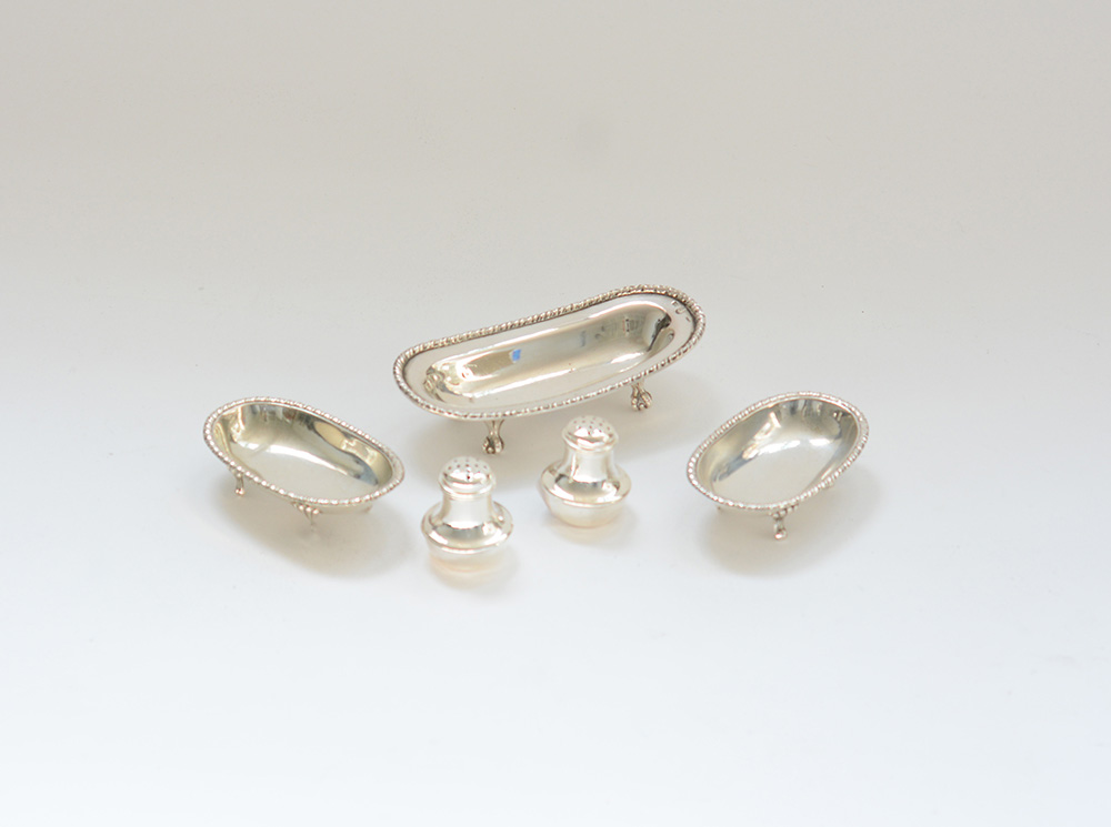 Lotto composto da tre saliere a vaschetta e un sale/pepe in argento (gr. 148)