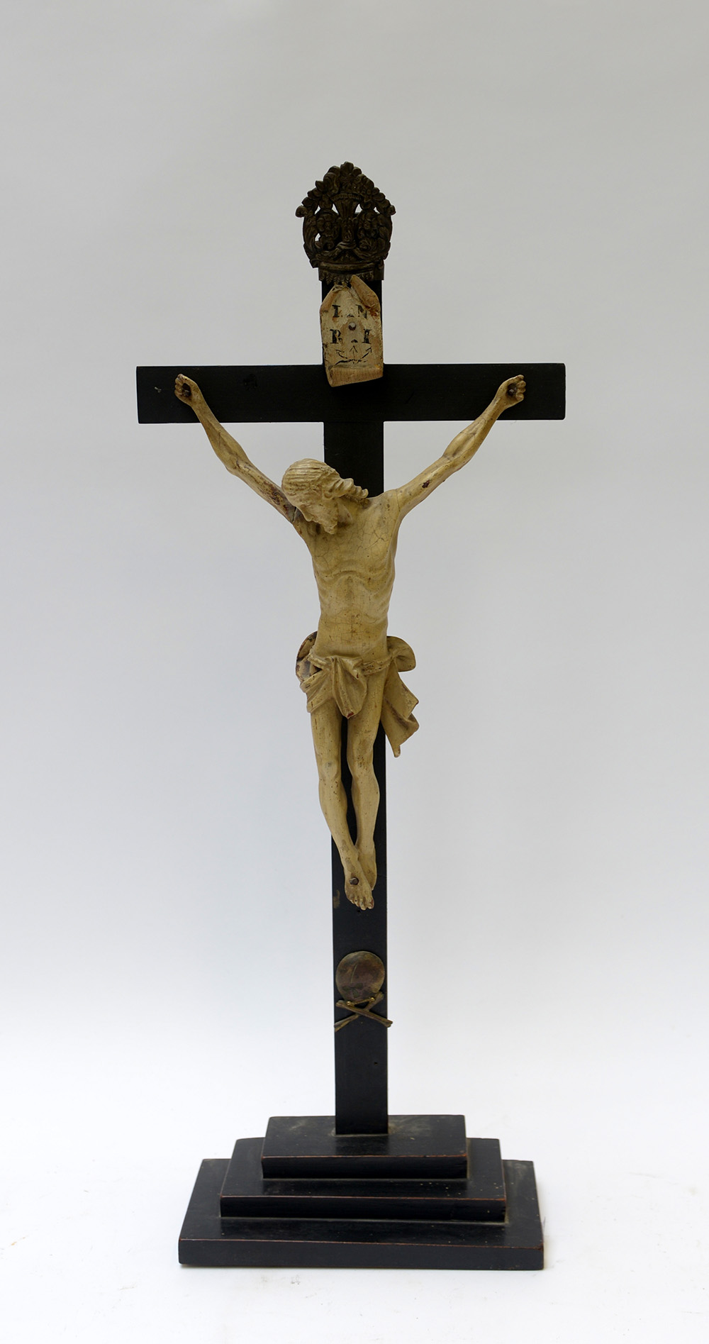 Arte del secolo XIX "Cristo crocifisso" scultura in legno laccato con base e croce ebanizzata (h. cm 66) (difetti)