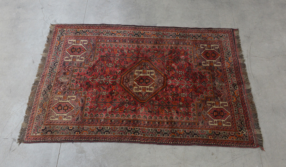 Tappeto Shiraz, Persia sec. XX Disegno a medaglione ottagonale su fondo rosso (cm 255x167) (difetti)