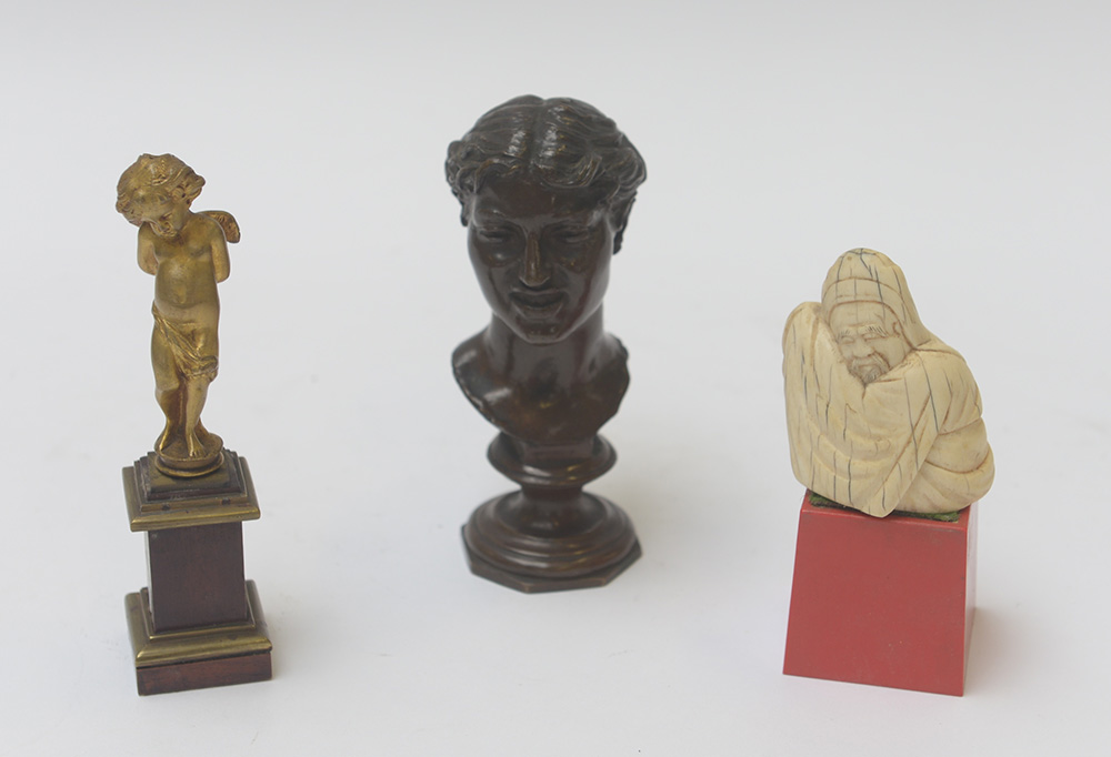 Lotto composto da tre sculturine in bronzo e osso di epoche e manifatture differenti (difetti