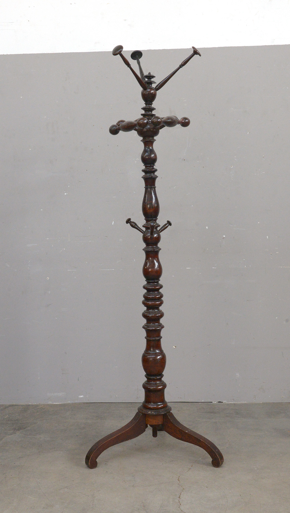 Attaccapanni in legno tornito a tinta scura con grucce porta abiti e porta cappelli (h cm 187) (difetti e restauri)