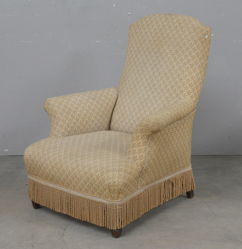 Poltrona da riposo con piedi mossi rivestita in tessuto operato con frange, fine secolo XIX (lievi difetti)