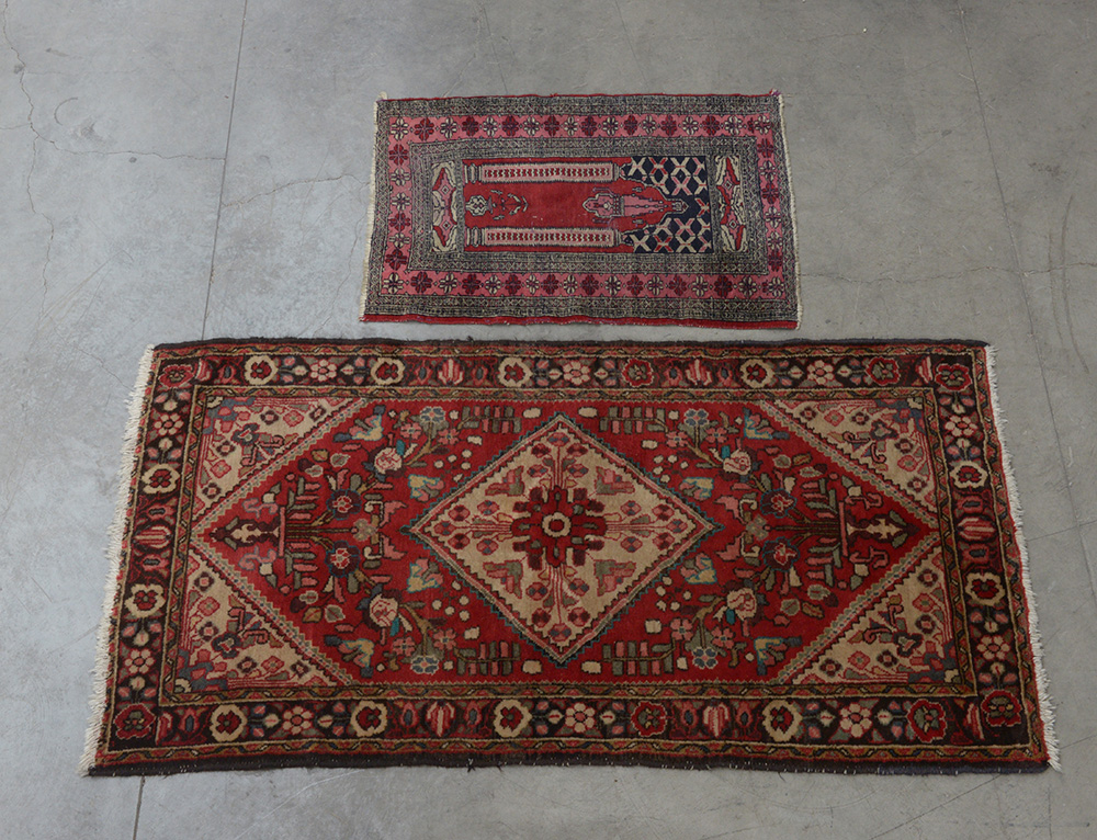 Lotto composto da due tappeti orientali con decori floreali geometrici, uno a preghiera (il più grande cm 213x110) (difetti)