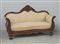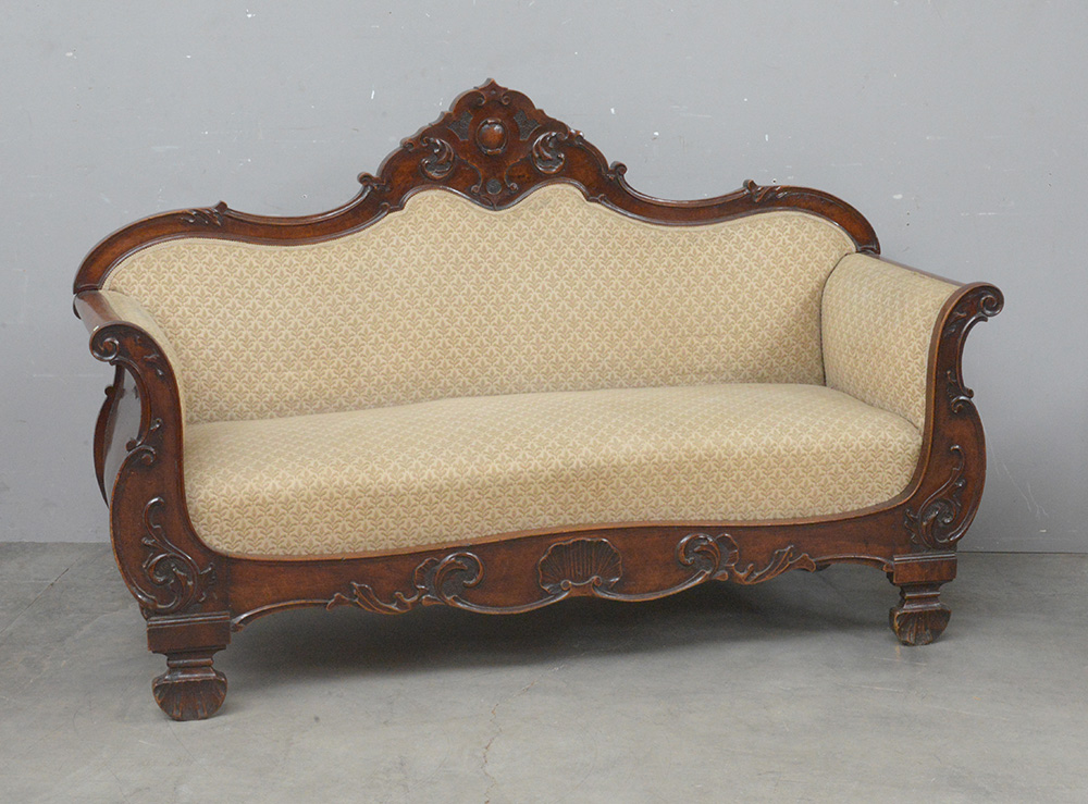 Divano a tre posti in legno con struttura mossa in noce intagliato a volute e conchiglie, rivestimento in tessuto operato. Metà secolo XIX (l cm 173) (difetti)
