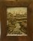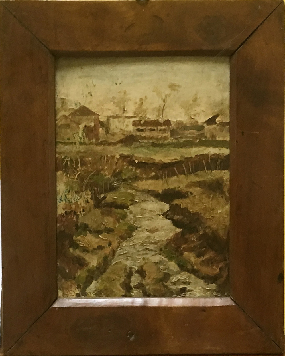Firma indecifrata "Scorcio con case e ruscello" olio su cartone pressato (cm 22x16) firmato in basso a sinistra, in cornice (difetti)