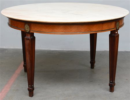 Tavolo tondo con fascia lastronata a lisca di pesce e decorata da rosoni in...