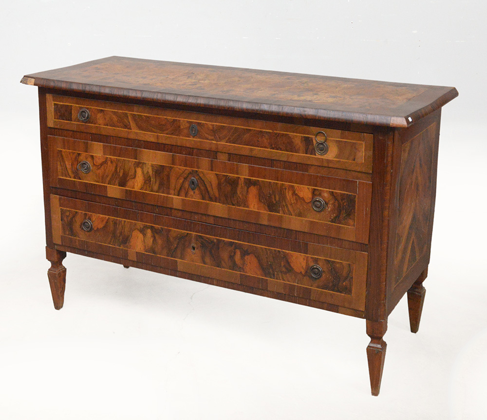 Antico comò a due cassetti e mezzo in noce e radica di noce e filettato, piedi tronco piramidali (cm 129x82x51) (difetti, restauri e mancanze)