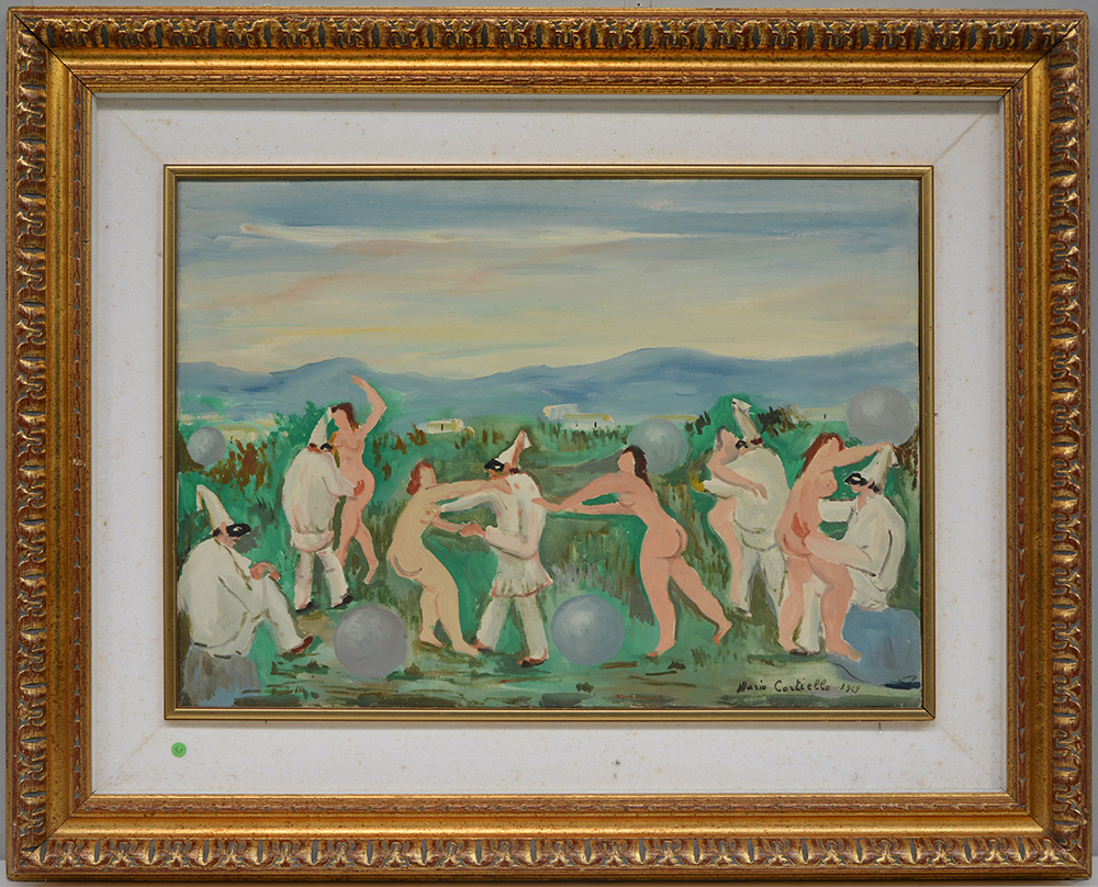 Mario Cortiello (Napoli 1907 - San Sebastiano Al Vesuvio 1981) "Pulcinella in villeggiatura" olio su tela (cm 50x70) firmato e datato 1969 in basso a destra. Titolato, firmato e autenticato al verso. In cornice (difetti)