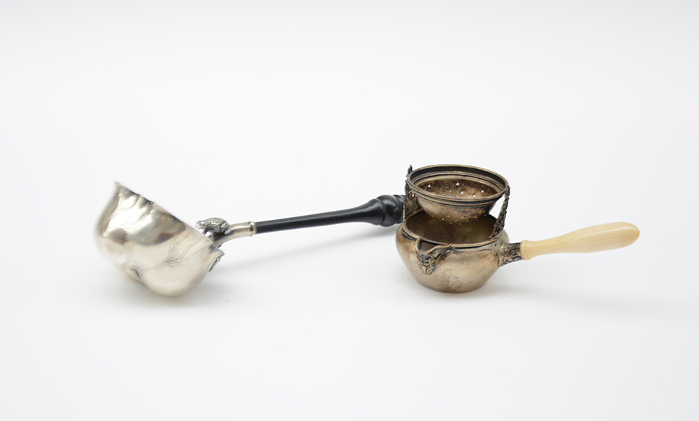 Lotto composto da un mestolo in argento con manico ebanizzato e un colino (gr. lordi 200) (difetti)