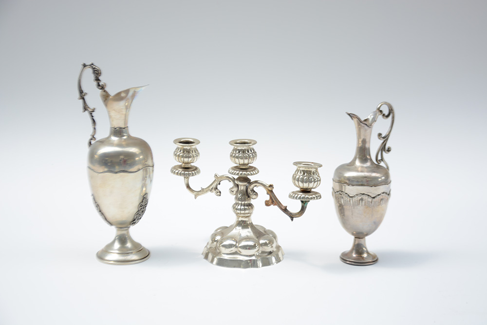 Lotto composto da un candeliere e due anfore in argento (gr. 630)