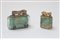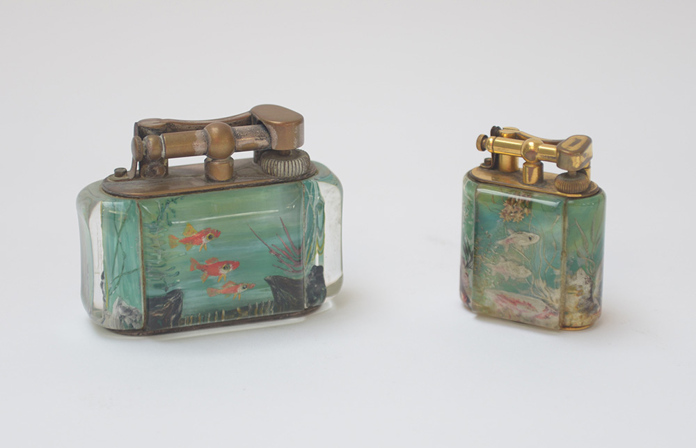 Lotto di due accendini Dunhill con corpo in plexiglass dipinto a scene marine (difetti)