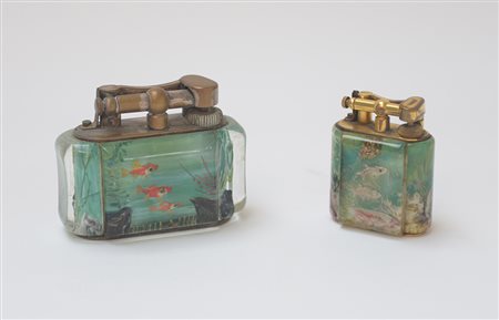 Lotto di due accendini Dunhill con corpo in plexiglass dipinto a scene marine...