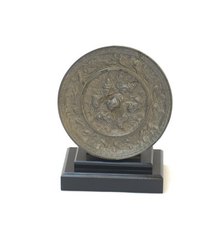 Manifattura cinese. Specchio in bronzo in stile Tang con leoni ed uva (difetti) (d. 12 cm.)