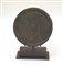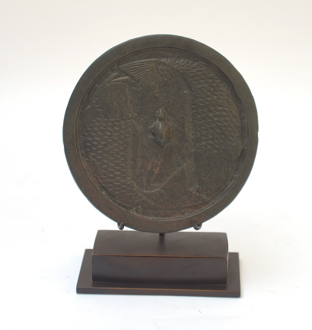 Manifattura cinese. Specchio in bronzo in stile arcaico con coppia di carpe ed iscrizione, con base (difetti) (d. 17 cm.)