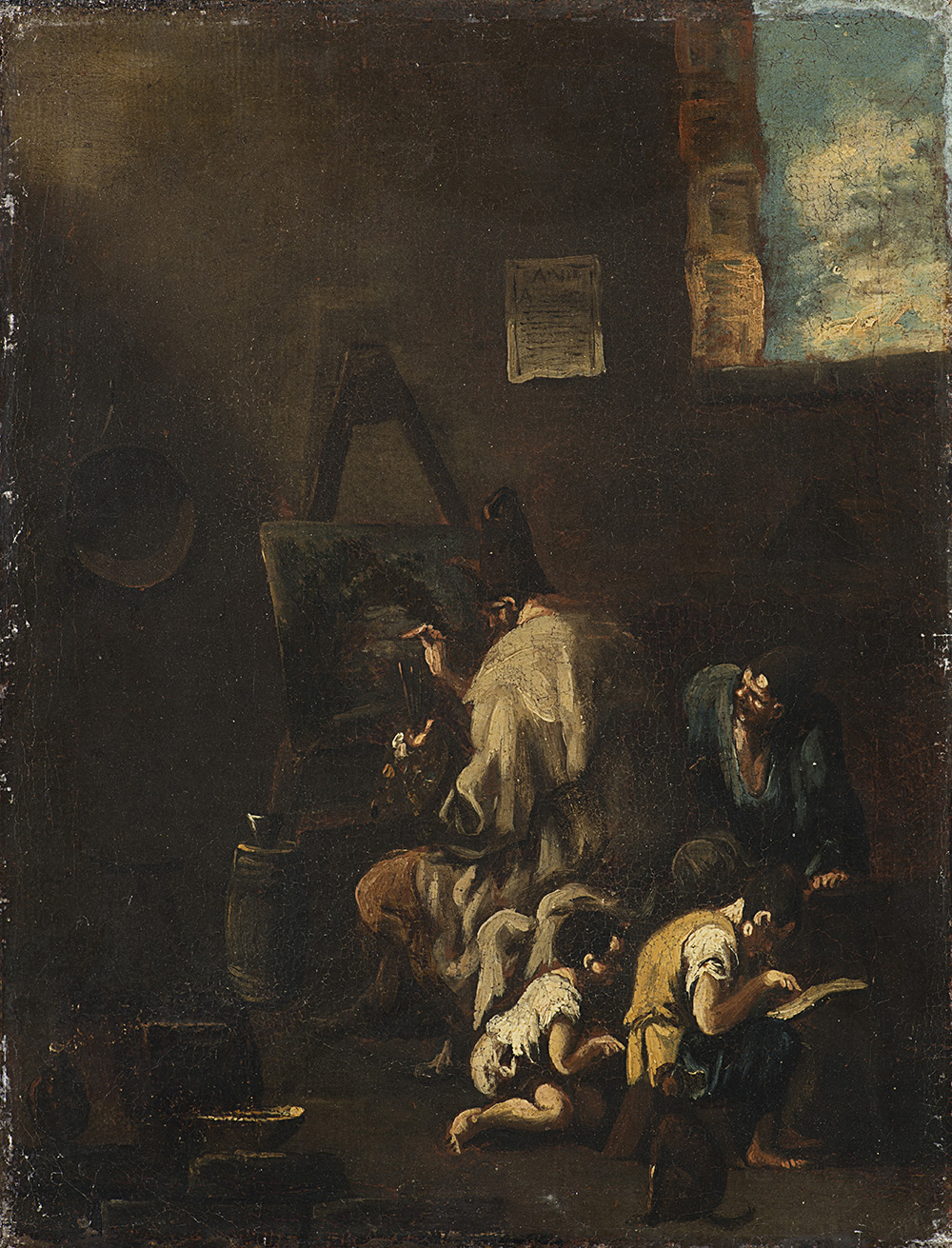 Seguace del Magnasco, coppia di dipinti ad olio su tela raffiguranti scene d'interno con giocolieri e pittori (cm 36x28)in cornice(difetti)