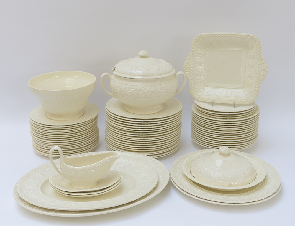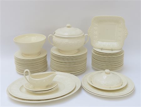 Manifattura di Wedgwood, parte di servizio da tavola in ceramica serie ''Etruria'' composto da sedici piatti fondi, diciannove piani, venti sottopiatti, quattro piattini da frutta, sei piatti da portata differenti, salsiera e due raviere, zuppiera e insalatiera