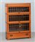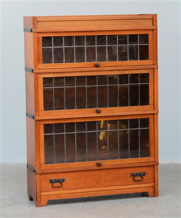 Mobile da ufficio in legno dolce a tre cassetti con struttura componibile, sportelli sollevabili con vetri legati a piombo, cassetto alla base e piedi a mensola (cm 88x127x28) (difetti)