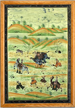 Dipinto su tessuto raffigurante scena di caccia alla tigre, in cornice (lievi difetti) Manifattura indiana, sec. XIX (cm 97x65)