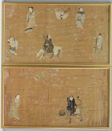 Coppia di frammenti di pannello in raso di seta color rosa. Ricamato in seta e fili d'oro applicati, raffiguranti scena con personaggi e drago. Cina fine sec. XIX, in cornici (cm 83x46) (lievi difetti e mancanze)