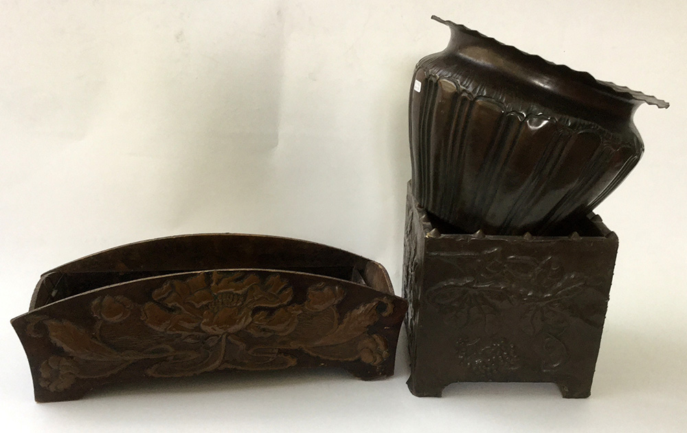 Lotto composto da un cachepot in rame e due fioriere in legno con rivestimento in rame sbalzato a motivi floreali (difetti)