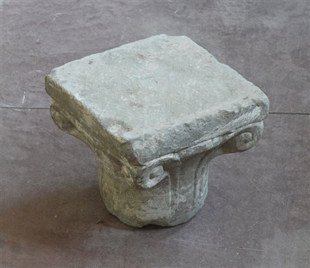 Antico capitello in pietra scolpito a volute (cm 28x25x27) (difetti)
