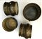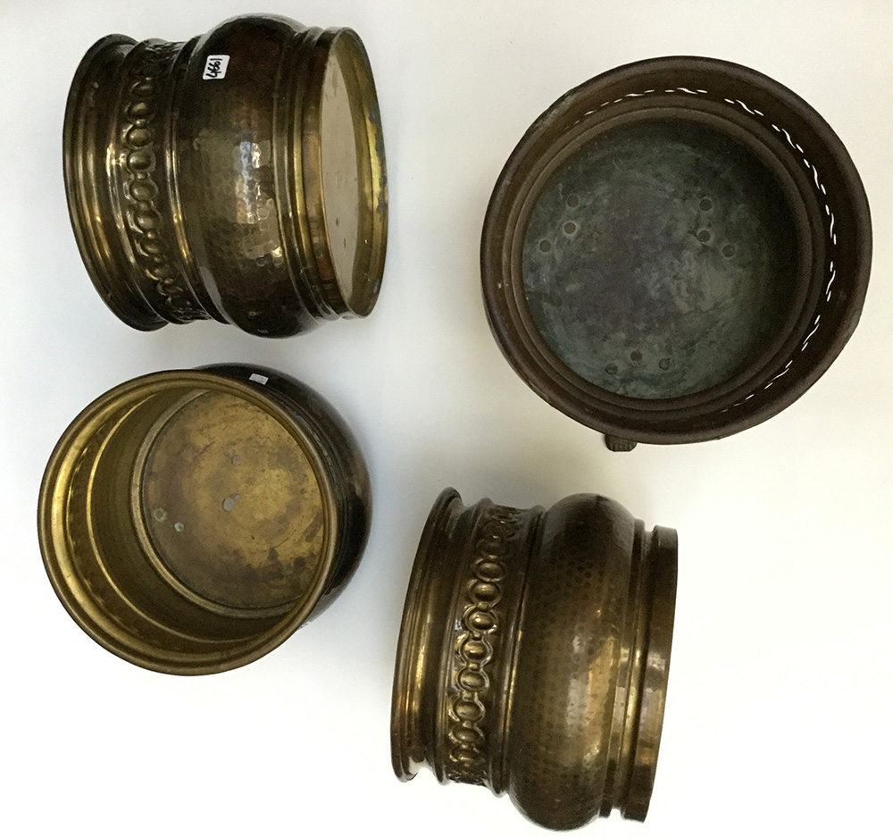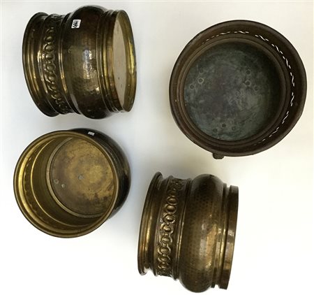 Lotto composto da tre cachepot in metallo sbalzato ed uno in rame traforato sorretto da piedini (difetti)