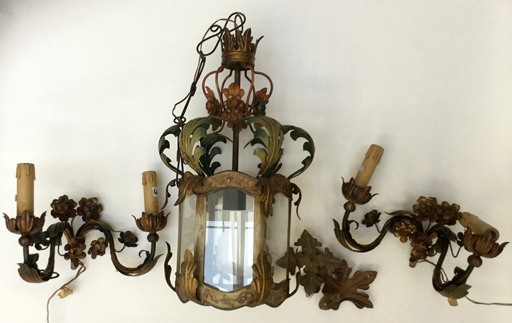Lotto composto da un lampadario da portico e due appliques a due luci in lamiera sagomata e dipinta (difetti)