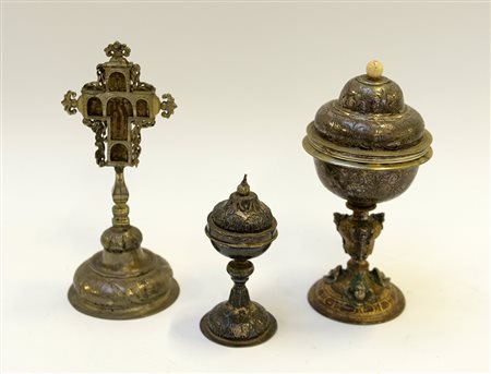 Lotto composto da due pissidi in argento, uno con base in metallo argentato e un portareliquie in metallo argentato