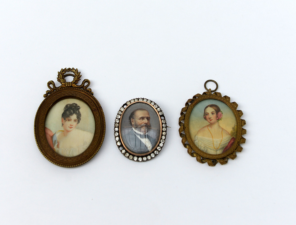 Lotto composto da tre miniature raffiguranti gentiluomo e gentildonne, in cornici (difetti)