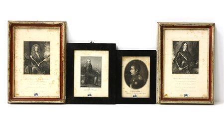 Gruppo di quattro incisioni del secolo XIX raffiguranti personaggi storici, misure differenti. In cornici (difetti)