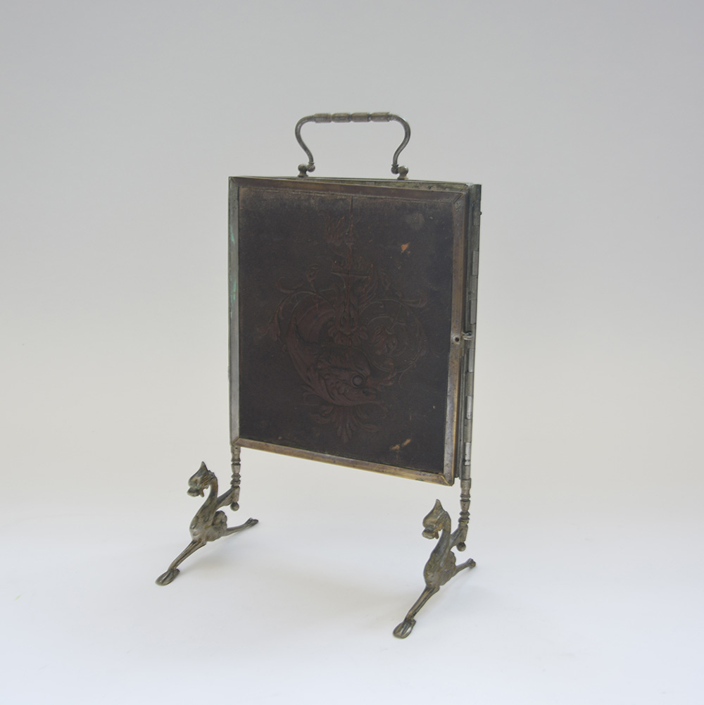 Specchiera da tavolo tripartita con struttura in metallo argentato rivestita in cuoio decorato in rilievo (difetti e mancanze)
