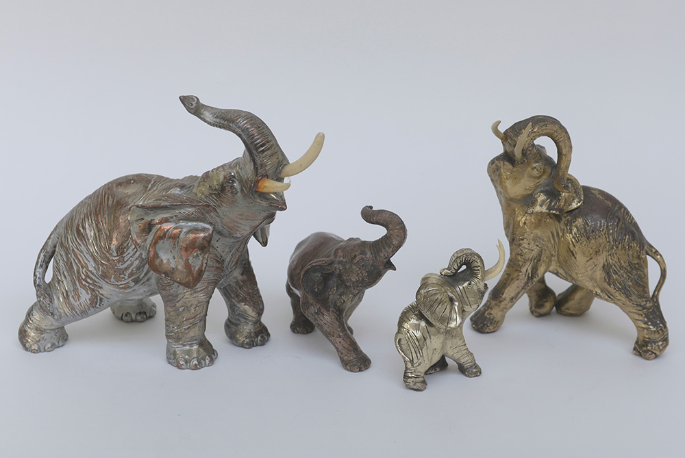 Lotto composto da quattro elefanti in metallo laminato in argento, uno...