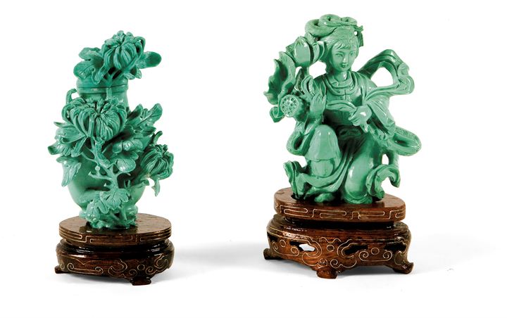 Lotto di due statuine in turchese raffiguranti: un personaggio femminile ed una bottiglia da profumo decorata con motivi floreali (piccola rottura)