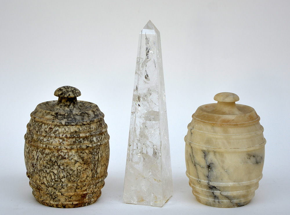 Lotto composto da due scatole in marmo e un obelisco in cristallo di Rocca (difetti)